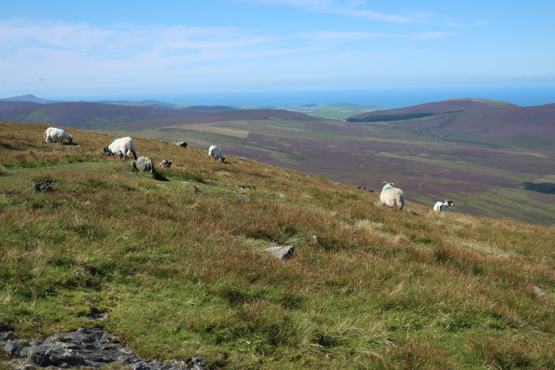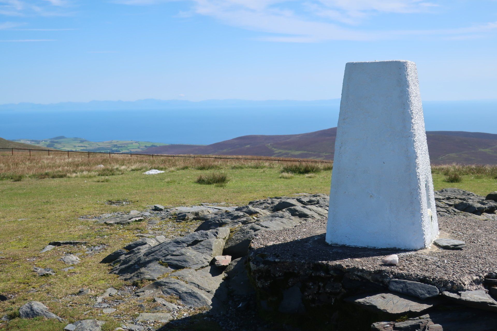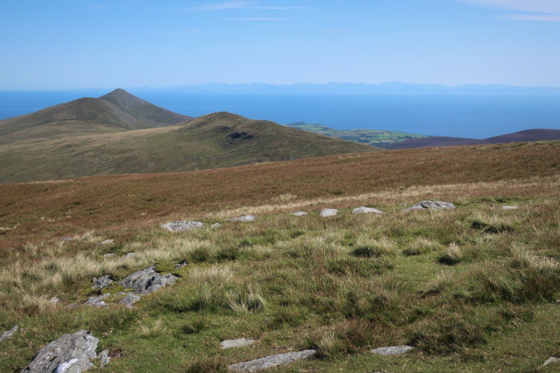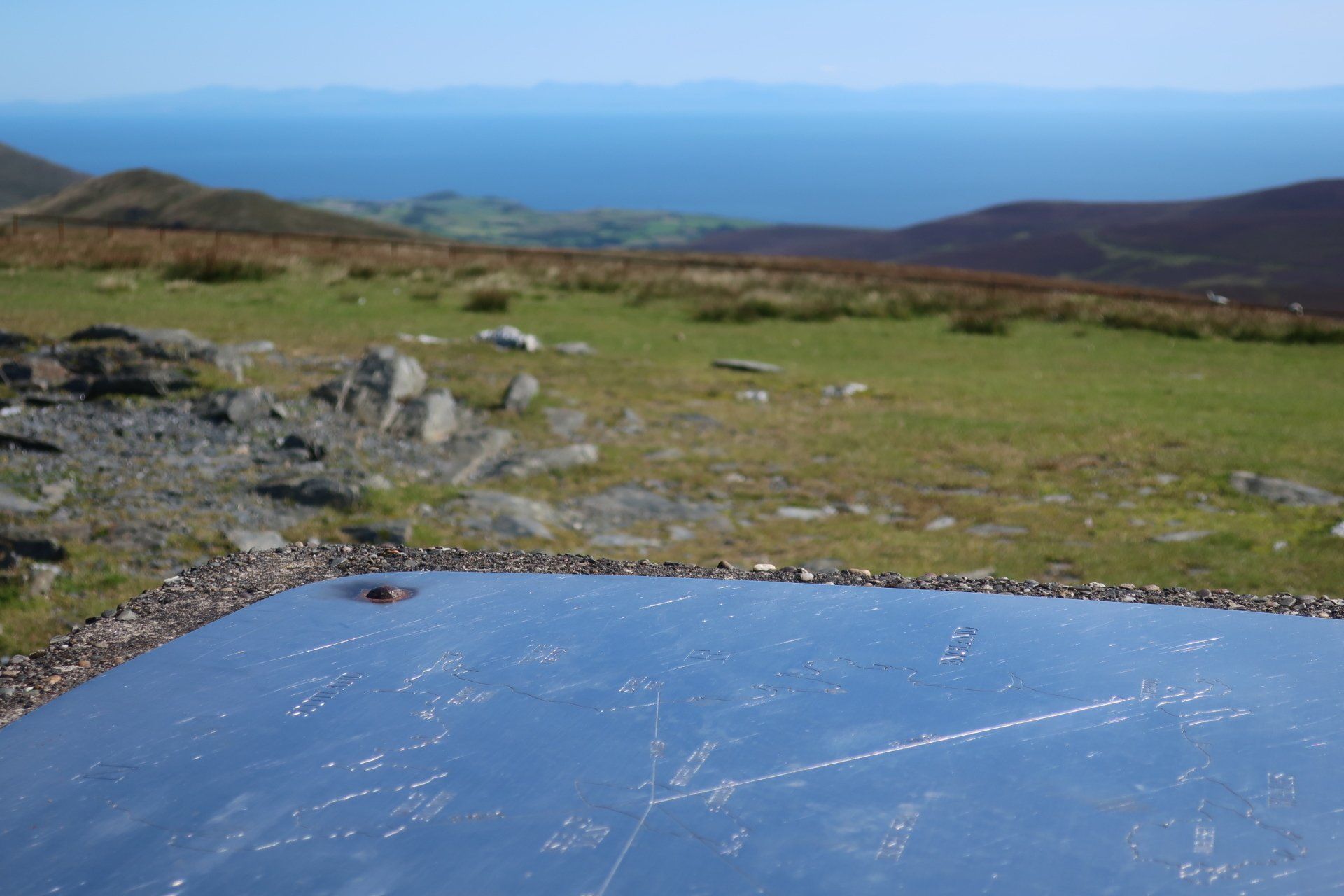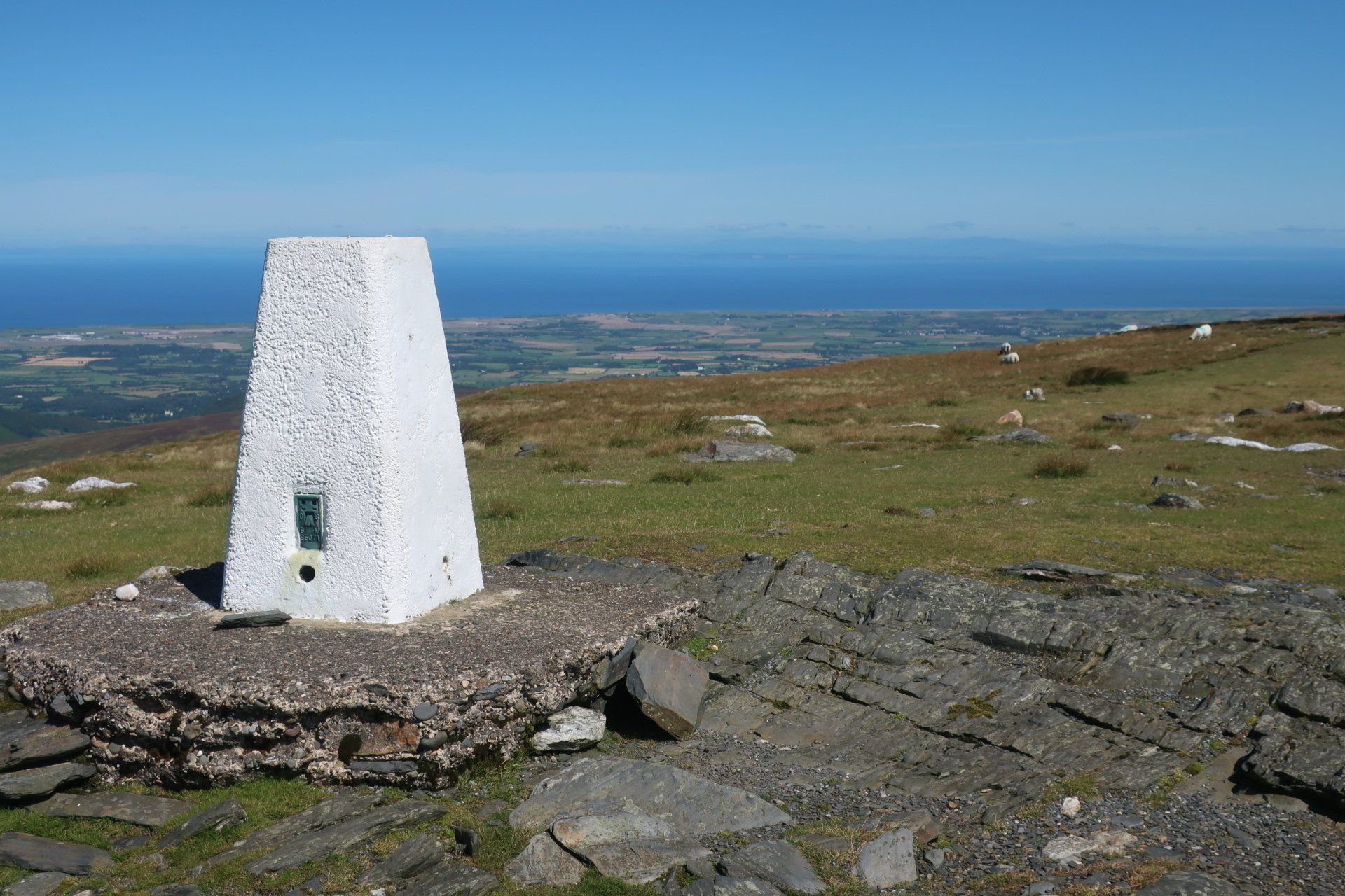 A steep scramble further over rough, grassy slopes and I reach the (inevitably windy) summit and trig point of Snaefell. Superb visibility and I can see the whole island laid out, further the outlines of land in England (Lake District hills), Scotland (Mull of Galloway), Wales (Isle of Anglesey) and Ireland (generally cloud covered). Love it. Whilst the coast walking has been good, I realise what a treat this is. I wallow in the pleasure