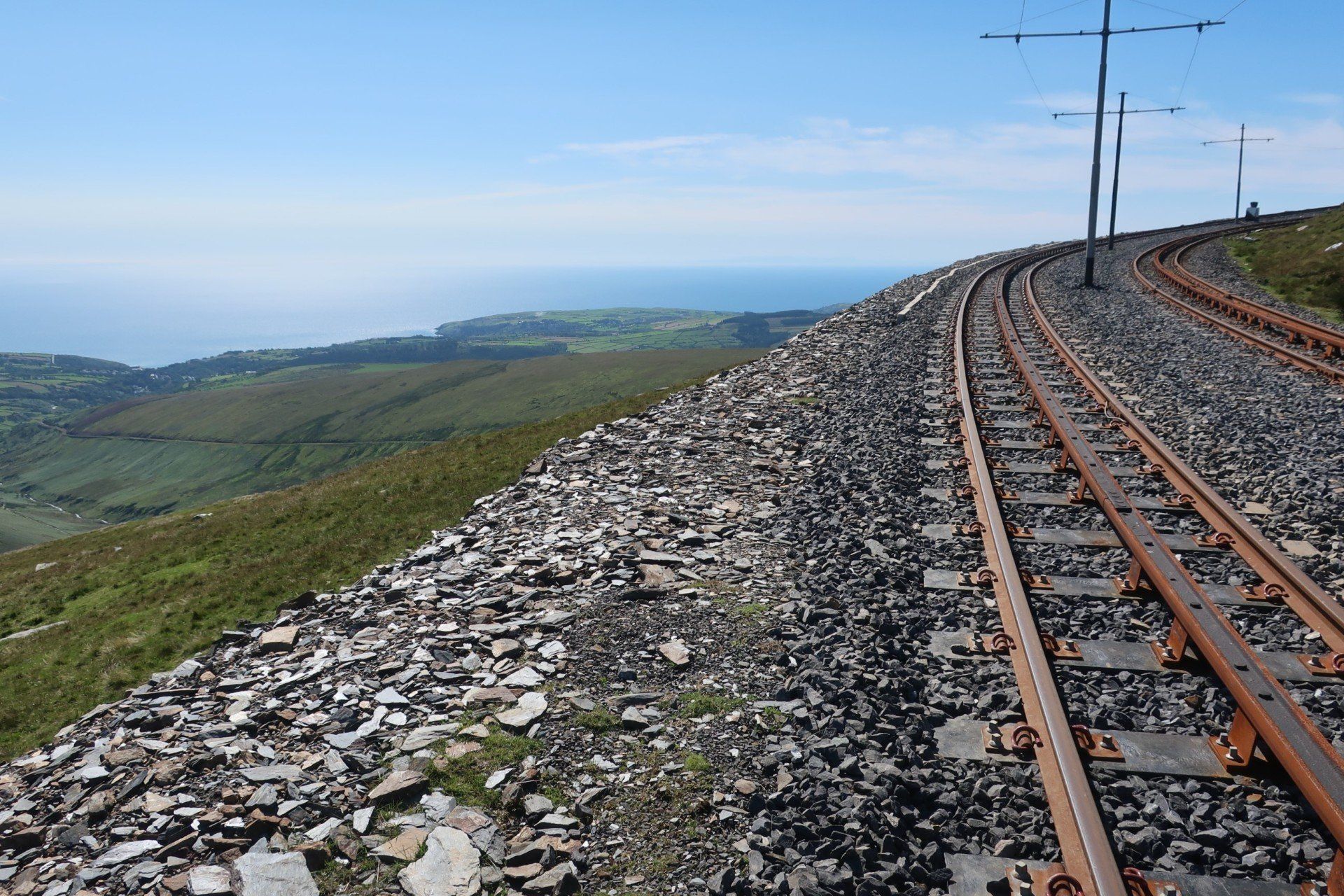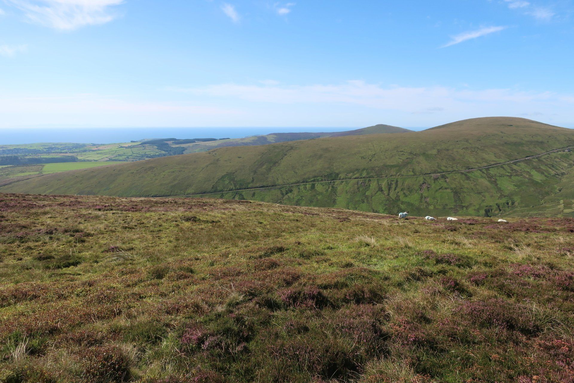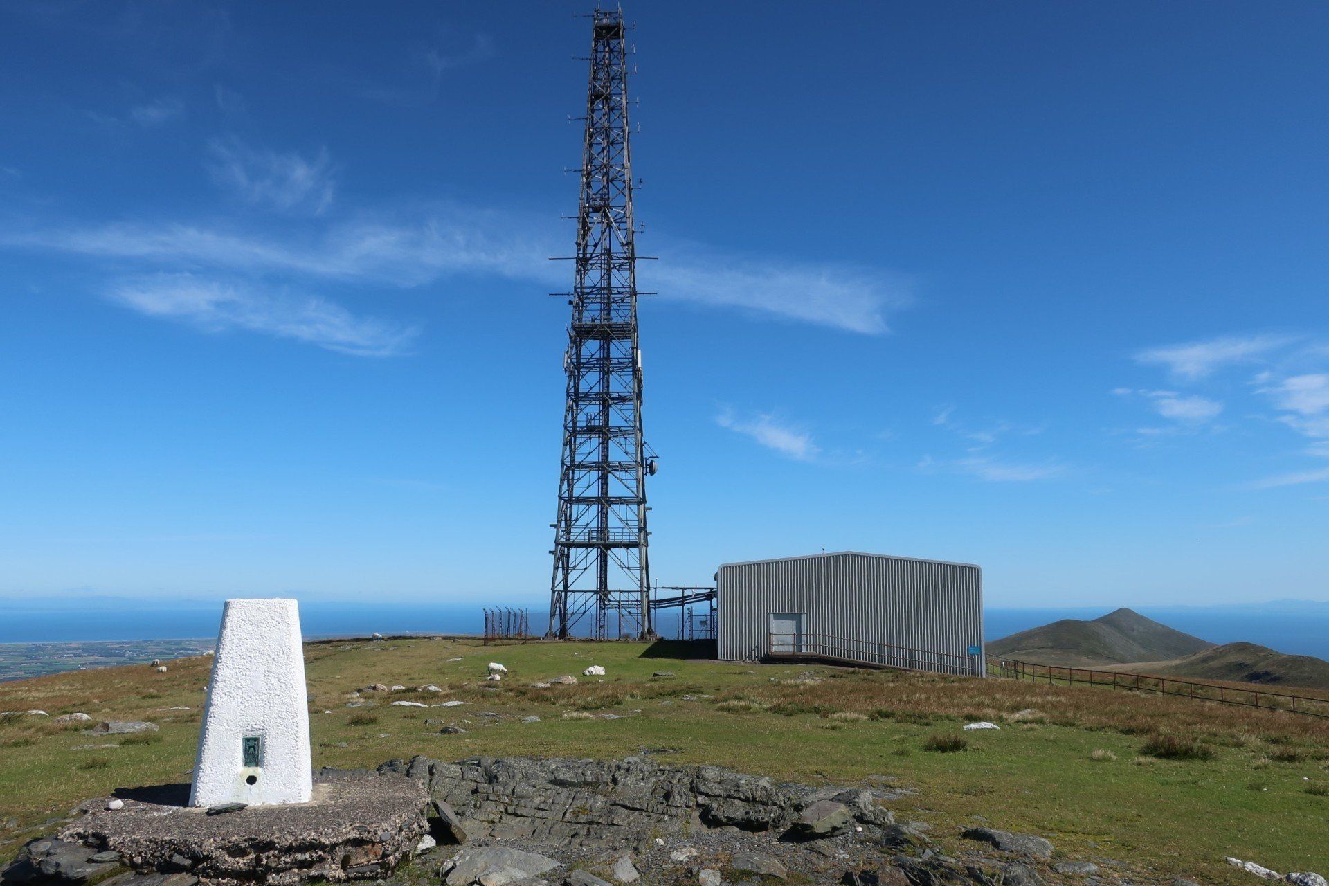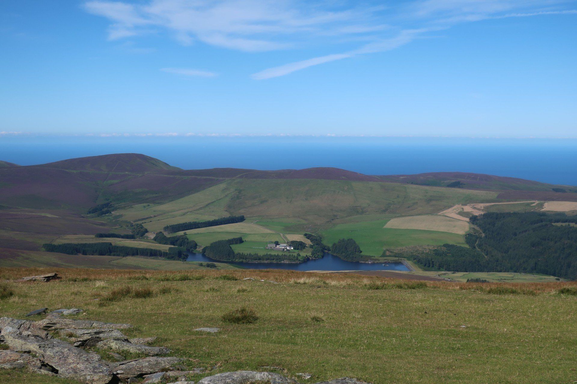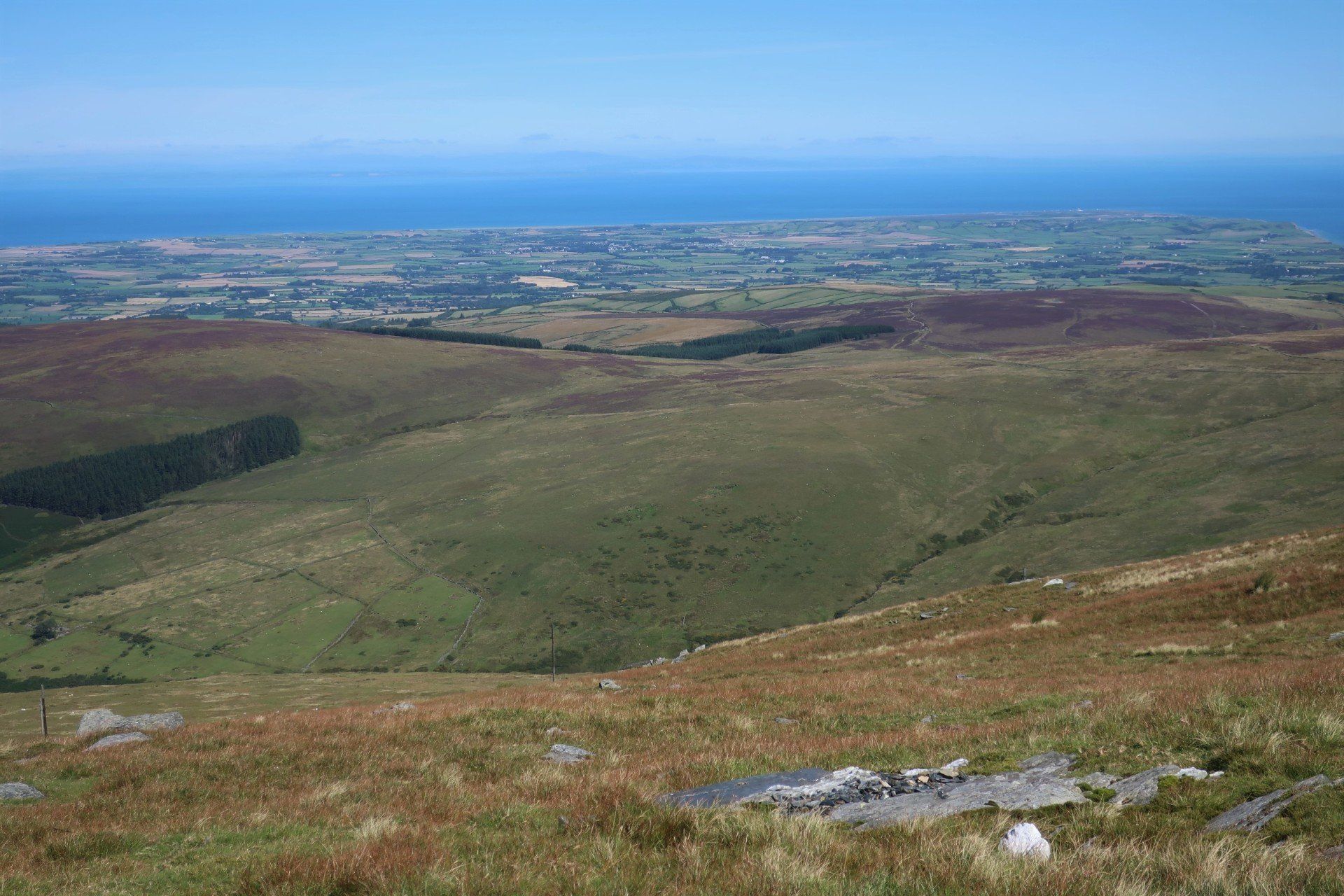 A steep scramble further over rough, grassy slopes and I reach the (inevitably windy) summit and trig point of Snaefell. Superb visibility and I can see the whole island laid out, further the outlines of land in England (Lake District hills), Scotland (Mull of Galloway), Wales (Isle of Anglesey) and Ireland (generally cloud covered). Love it. Whilst the coast walking has been good, I realise what a treat this is. I wallow in the pleasure