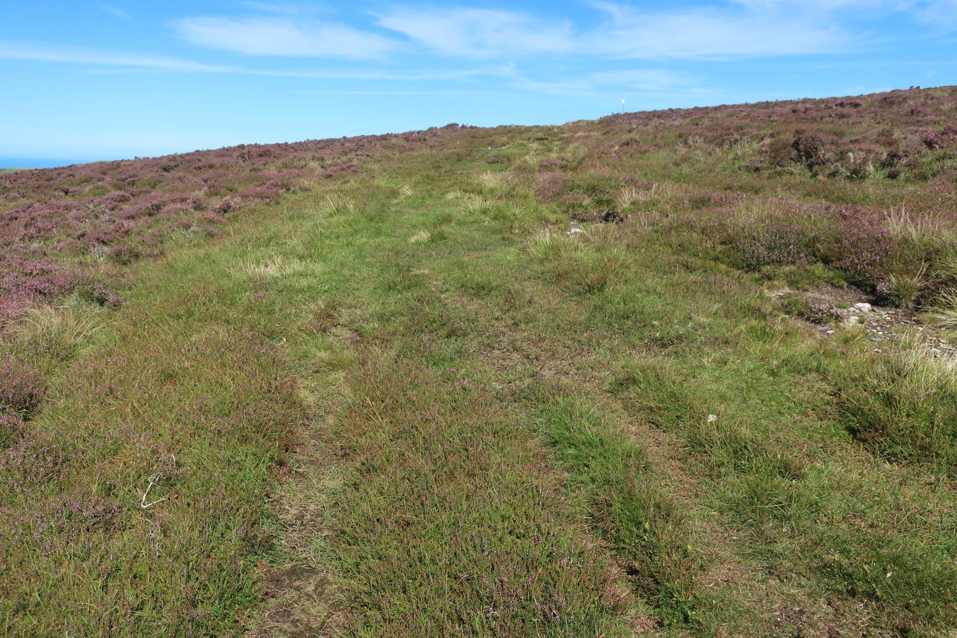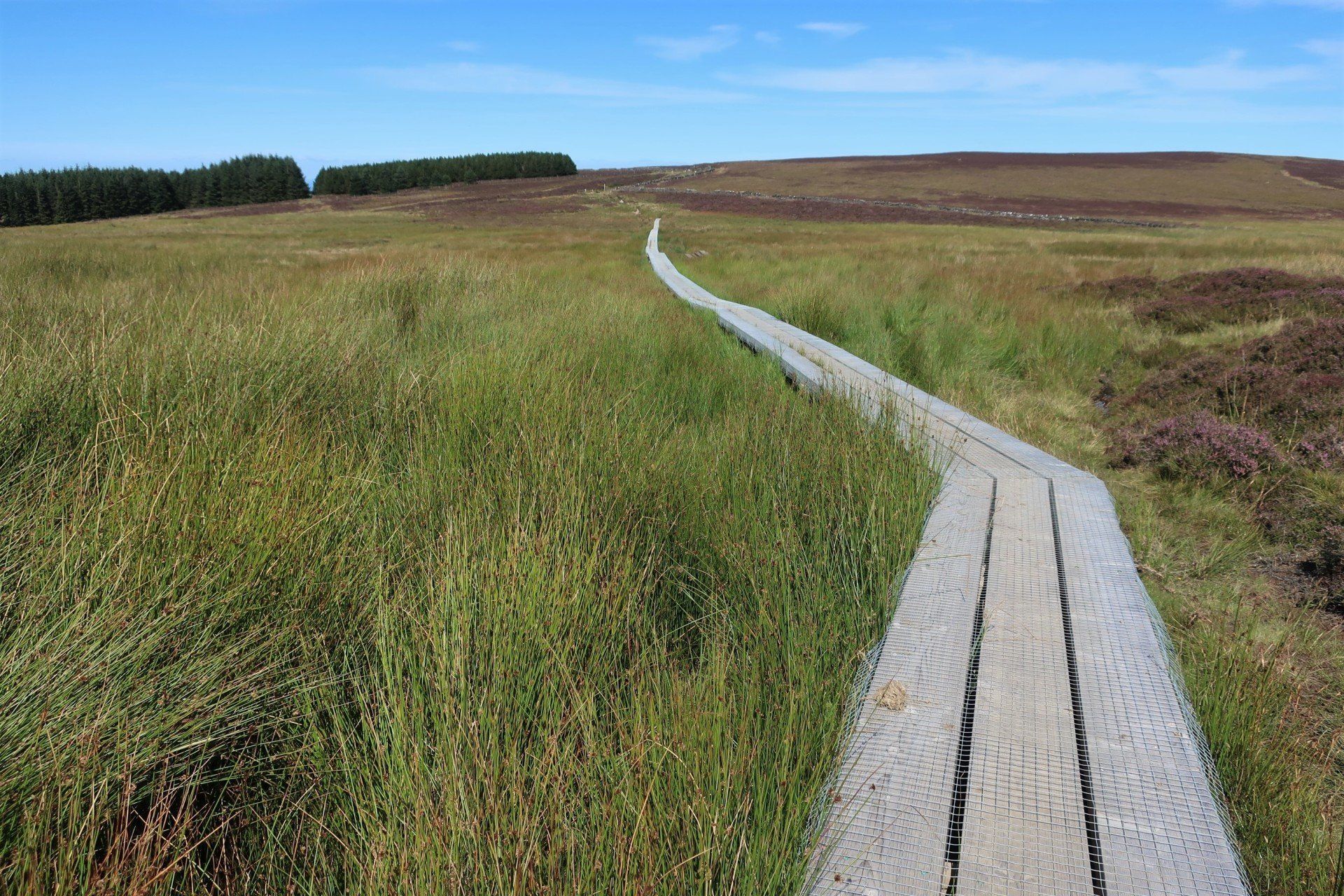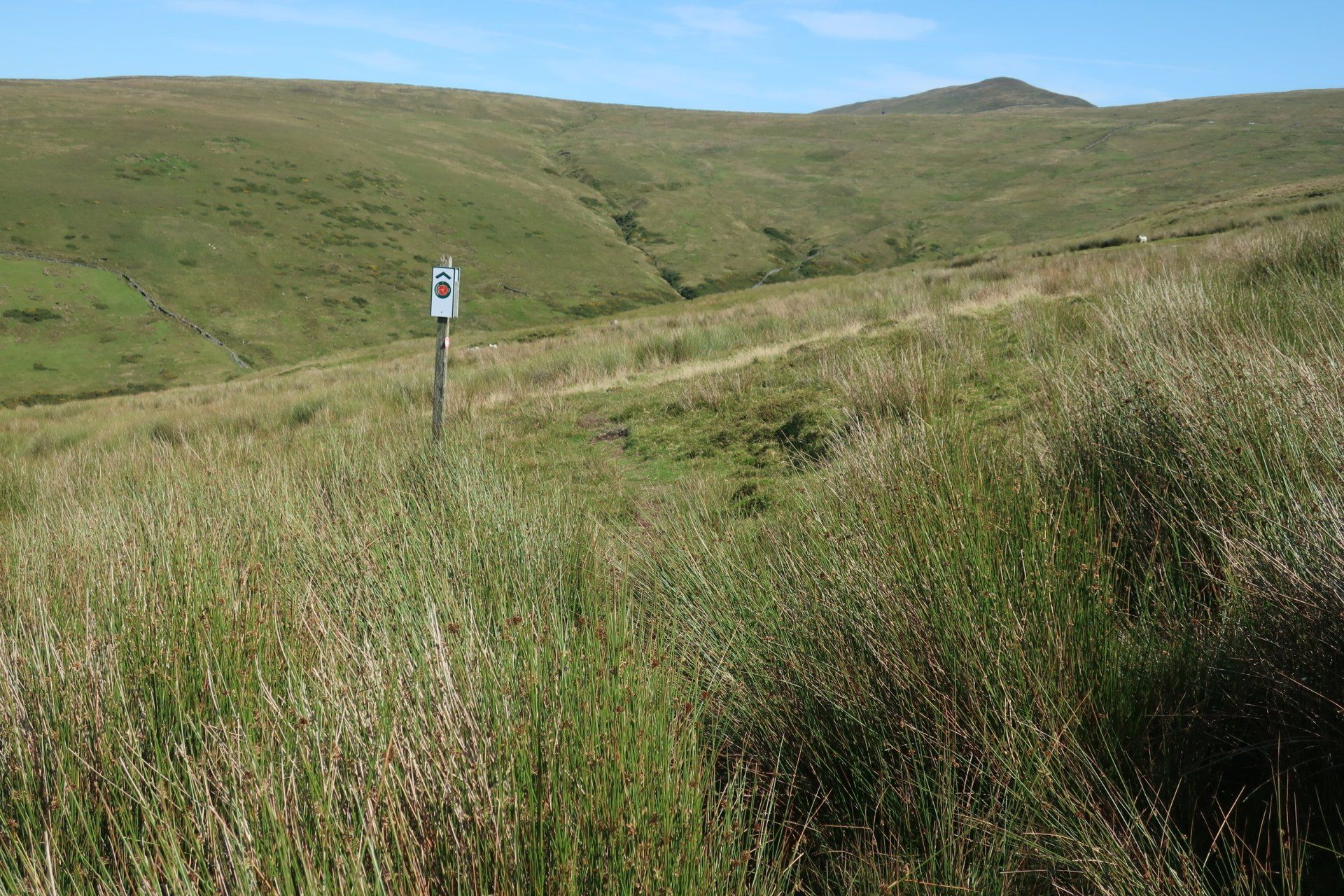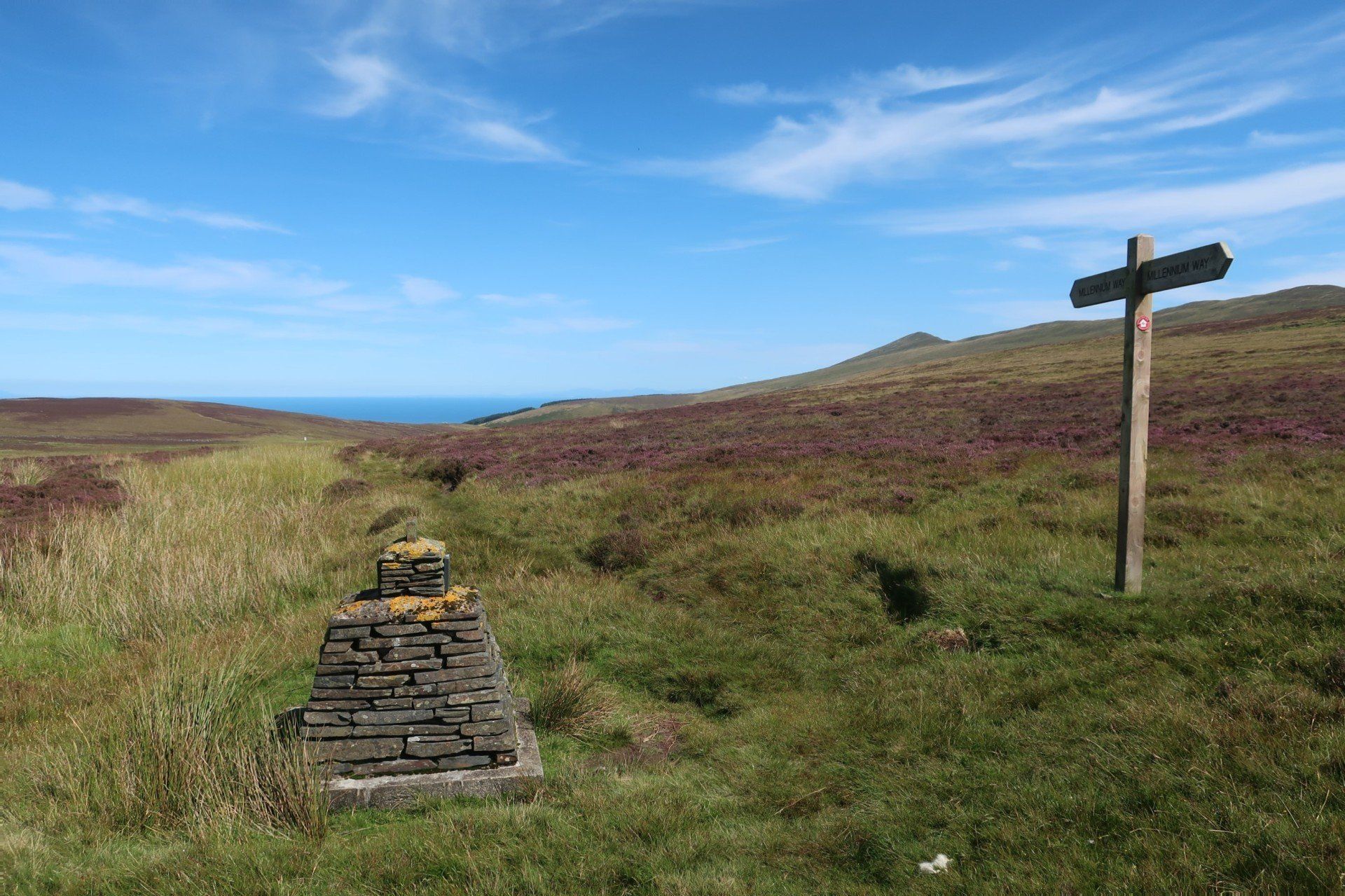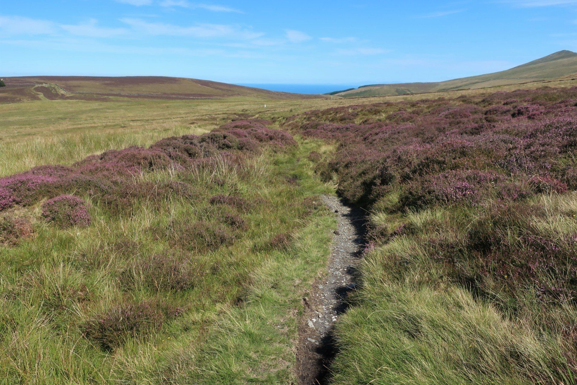 Some road walking follows (carefully as some fast cars) then I join the Millenium Way a way-market route established in 1979 that runs from Ramsey in the North to Castletown in the South, a distance of 26 miles, generally meandering around or alongside the hills, although still retaining some up & down. The section I am doing is wild moor by description, always soggy and often boggy, with limited trail (although excellent eye-line marking). After a while the novelty wears off, so when I come across a raised boardwalk a few miles on I take the opportunity for a sit down (the only dry place!) and snack. Today has certainly had a feeling of remoteness, despite knowing I am on a smallish island, and sat here sunbathing I enjoy the moment