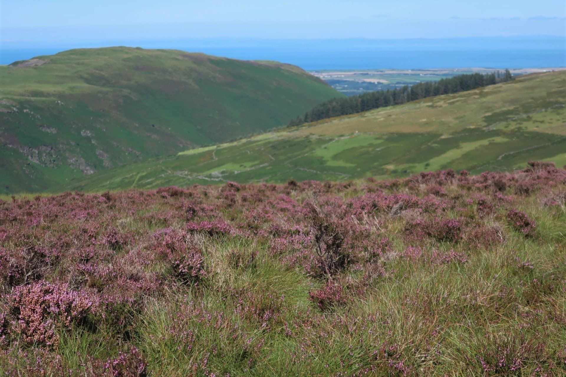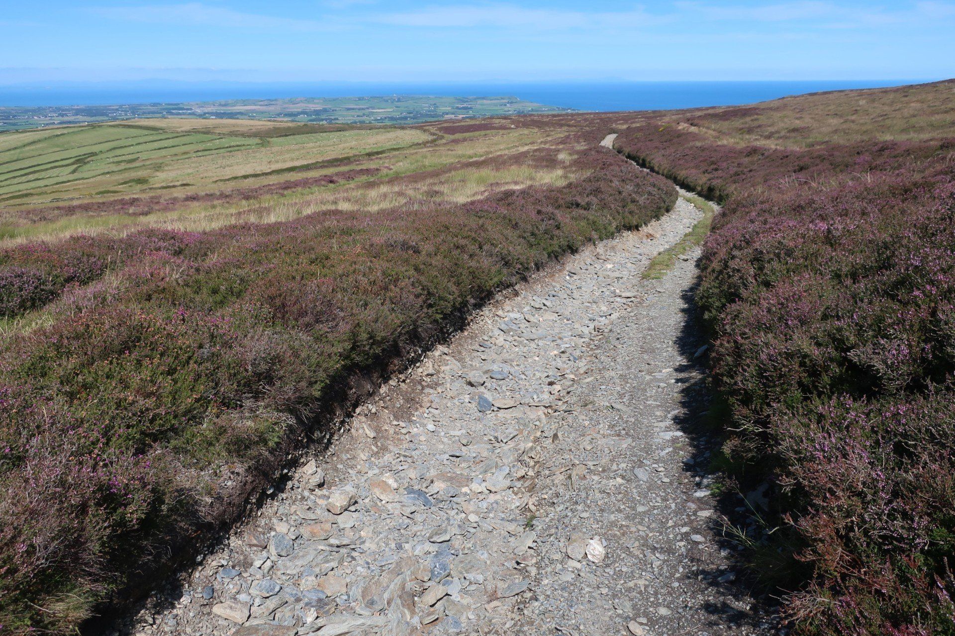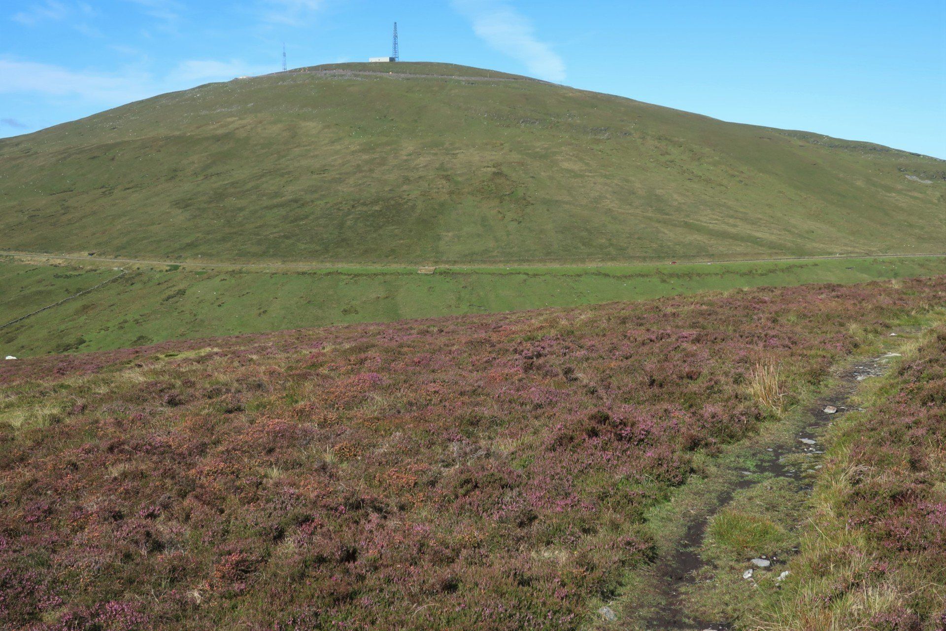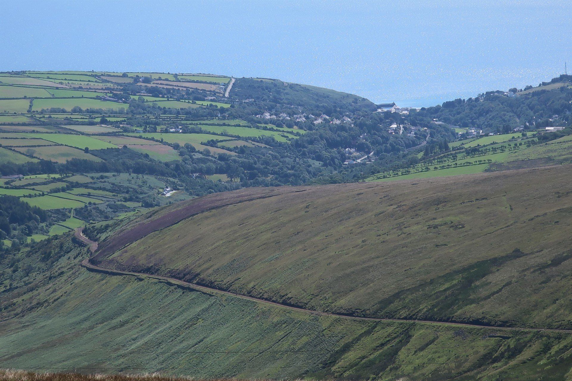 Some road walking follows (carefully as some fast cars) then I join the Millenium Way a way-market route established in 1979 that runs from Ramsey in the North to Castletown in the South, a distance of 26 miles, generally meandering around or alongside the hills, although still retaining some up & down. The section I am doing is wild moor by description, always soggy and often boggy, with limited trail (although excellent eye-line marking). After a while the novelty wears off, so when I come across a raised boardwalk a few miles on I take the opportunity for a sit down (the only dry place!) and snack. Today has certainly had a feeling of remoteness, despite knowing I am on a smallish island, and sat here sunbathing I enjoy the moment