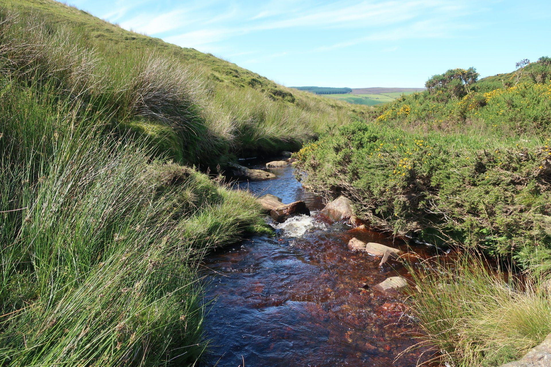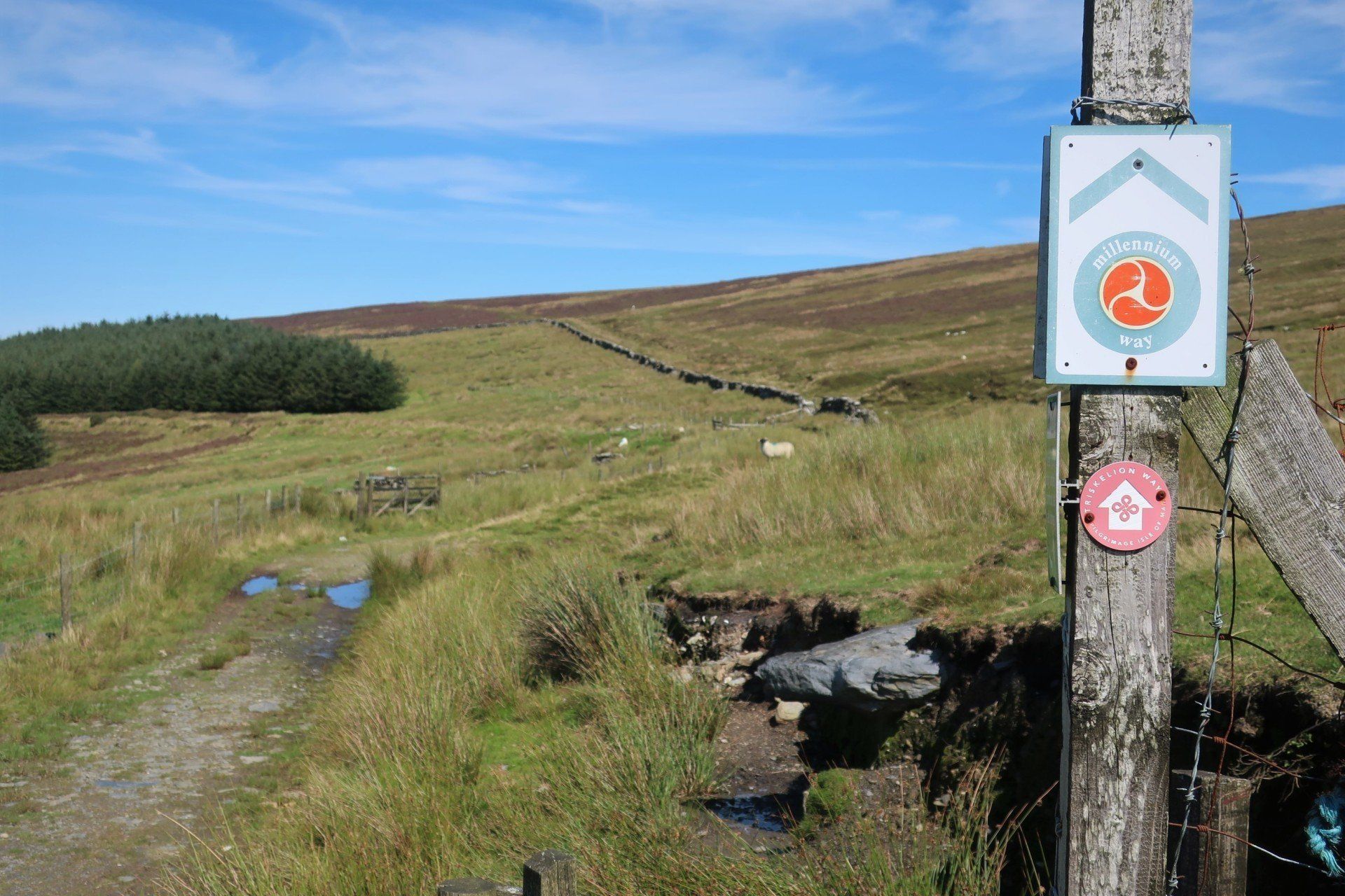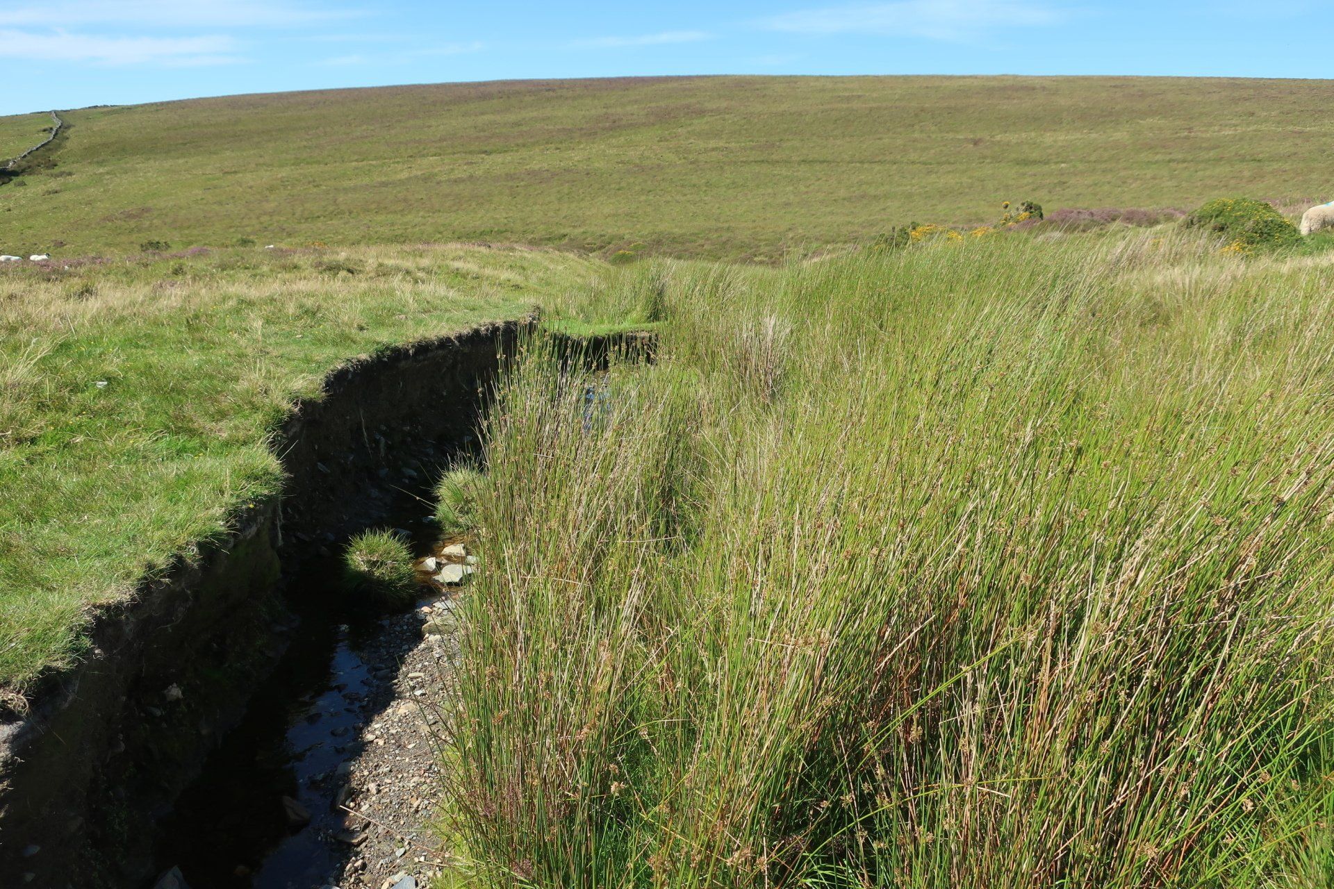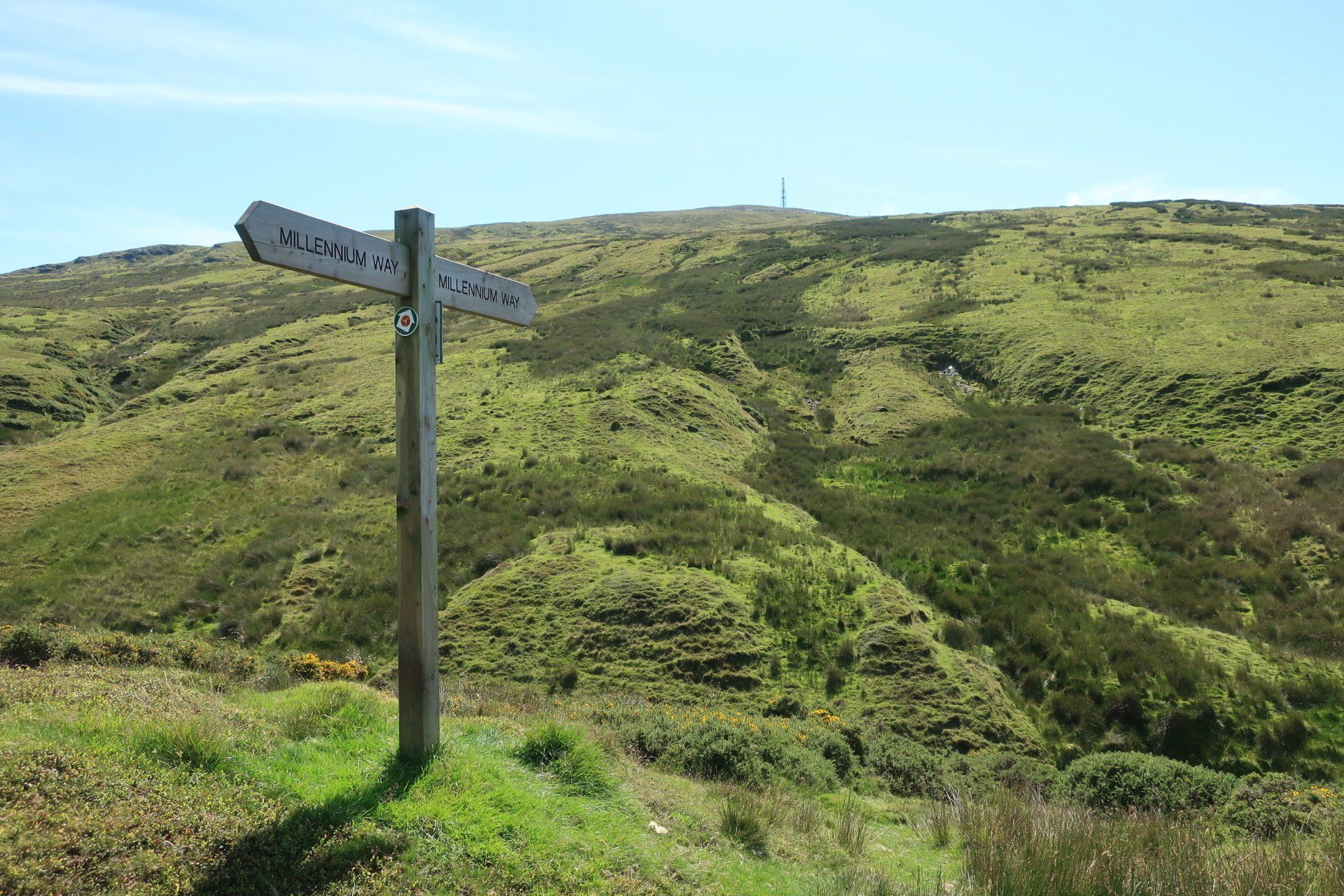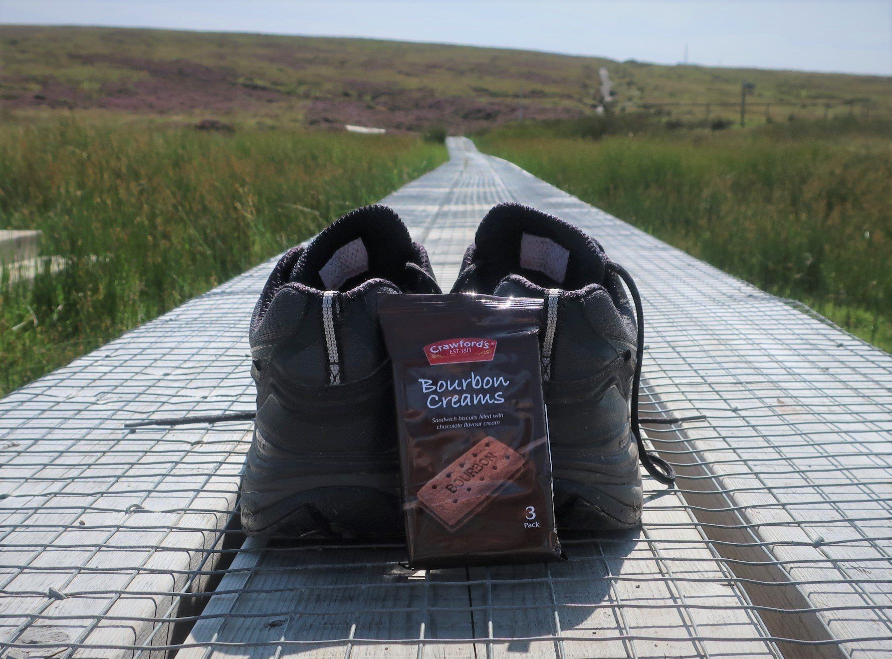 Some road walking follows (carefully as some fast cars) then I join the Millenium Way a way-market route established in 1979 that runs from Ramsey in the North to Castletown in the South, a distance of 26 miles, generally meandering around or alongside the hills, although still retaining some up & down. The section I am doing is wild moor by description, always soggy and often boggy, with limited trail (although excellent eye-line marking). After a while the novelty wears off, so when I come across a raised boardwalk a few miles on I take the opportunity for a sit down (the only dry place!) and snack. Today has certainly had a feeling of remoteness, despite knowing I am on a smallish island, and sat here sunbathing I enjoy the moment