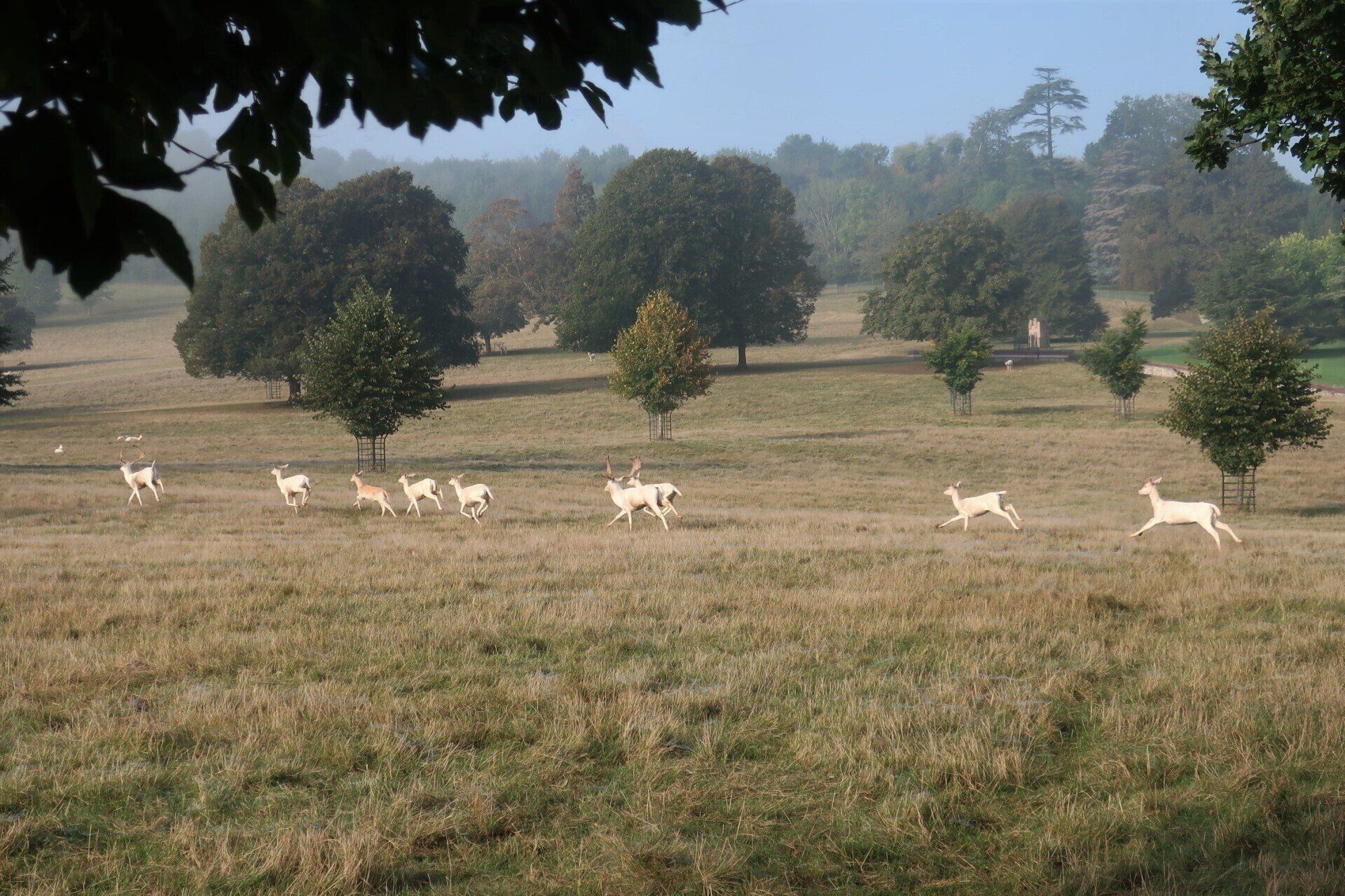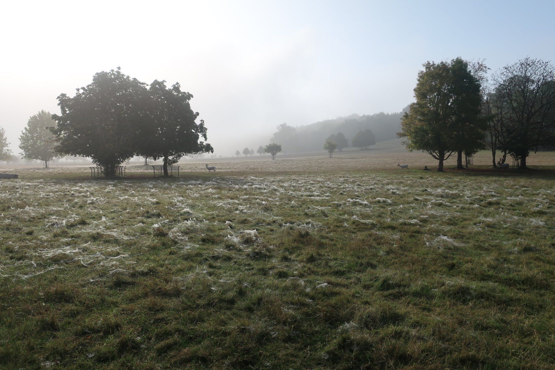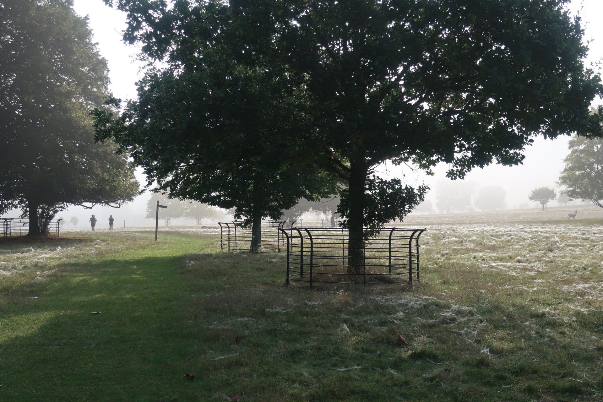 As I progress the sun tries to force through, slowly edging away the mist. I am diverted inland and enter large tree dotted, meadows, part of this area a deer farm. As I walk across these fields, the sun fully pushes through bathing the area in golden light, throwing shadows, the dew on the grass and the last mist tendrils adding atmosphere. This all topped off by the deer running around, a stag staring me down. It is a truly stunning spectacle. A couple of joggers pass me, one saying: “could you think of a better Saturday morning”. Quite