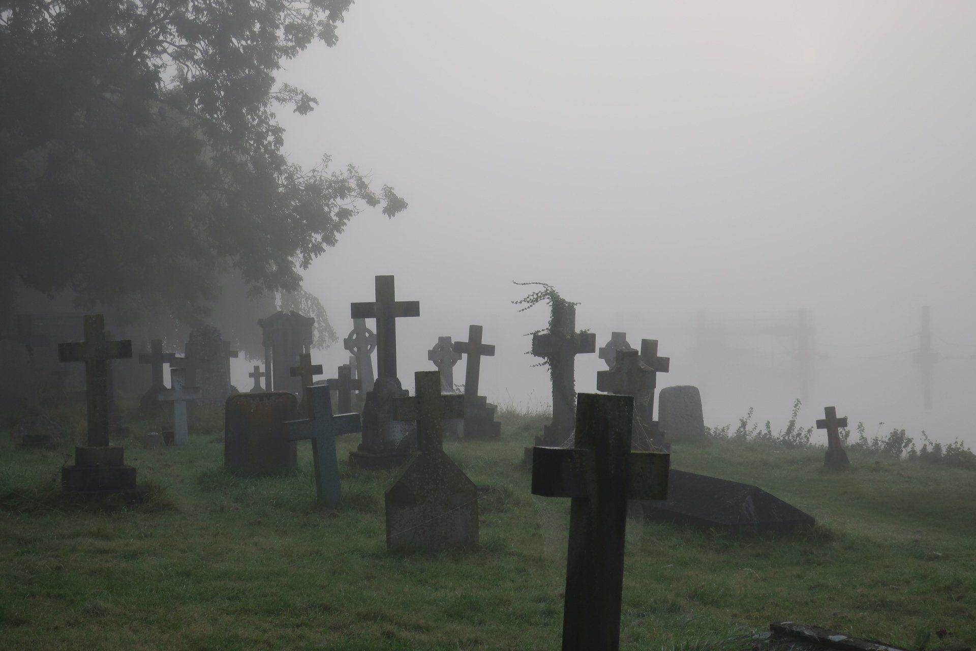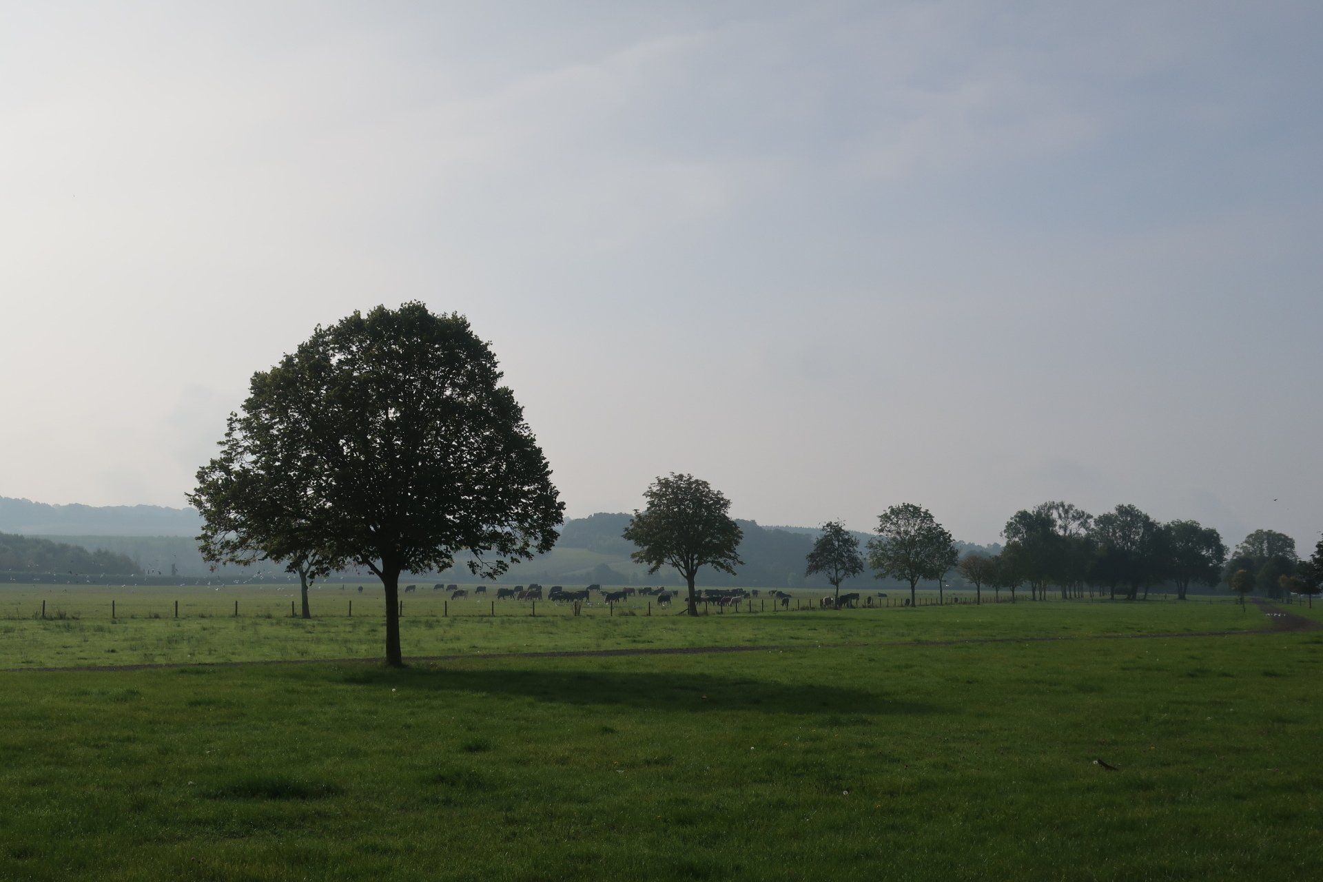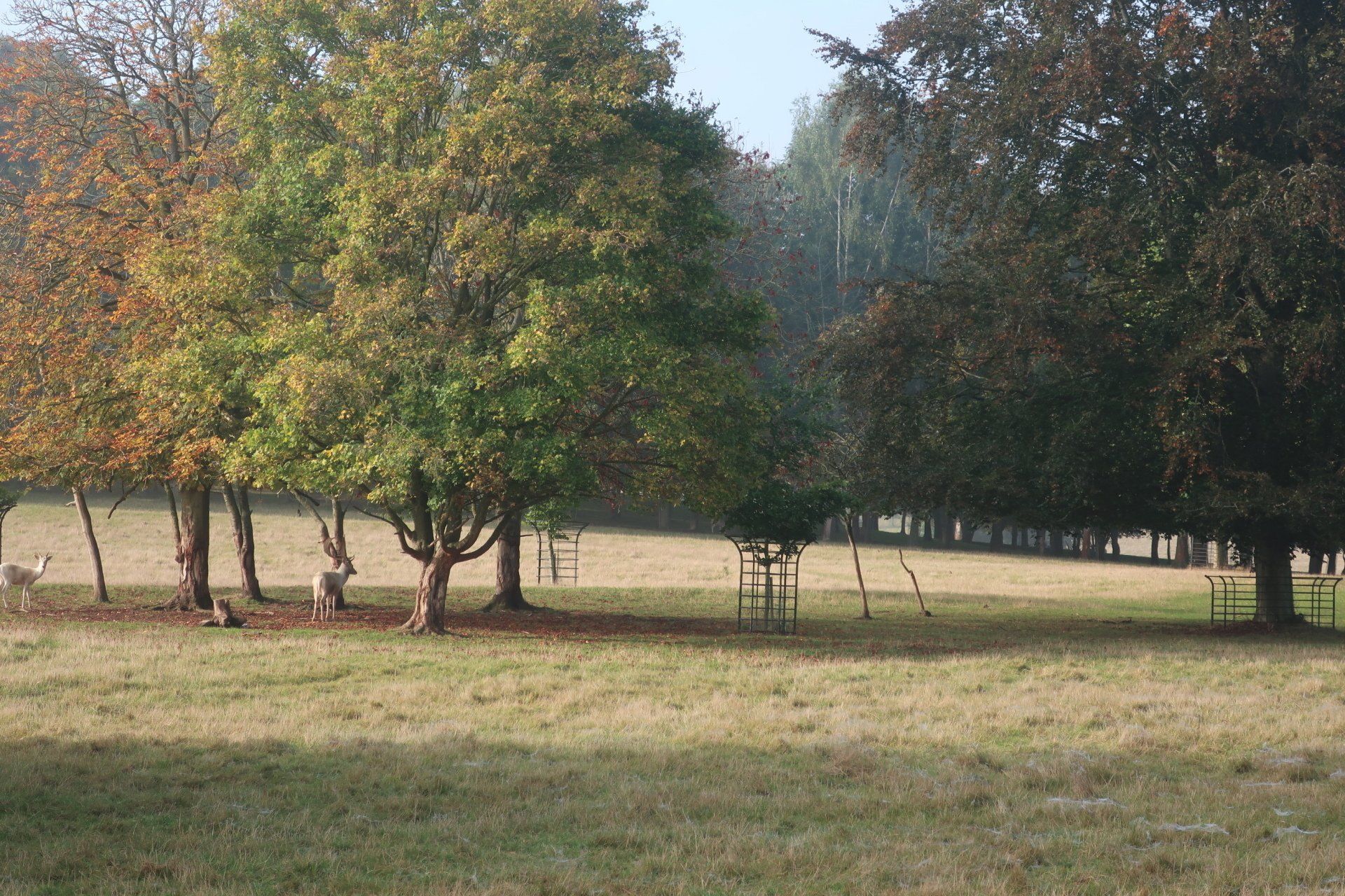 As I progress the sun tries to force through, slowly edging away the mist. I am diverted inland and enter large tree dotted, meadows, part of this area a deer farm. As I walk across these fields, the sun fully pushes through bathing the area in golden light, throwing shadows, the dew on the grass and the last mist tendrils adding atmosphere. This all topped off by the deer running around, a stag staring me down. It is a truly stunning spectacle. A couple of joggers pass me, one saying: “could you think of a better Saturday morning”. Quite