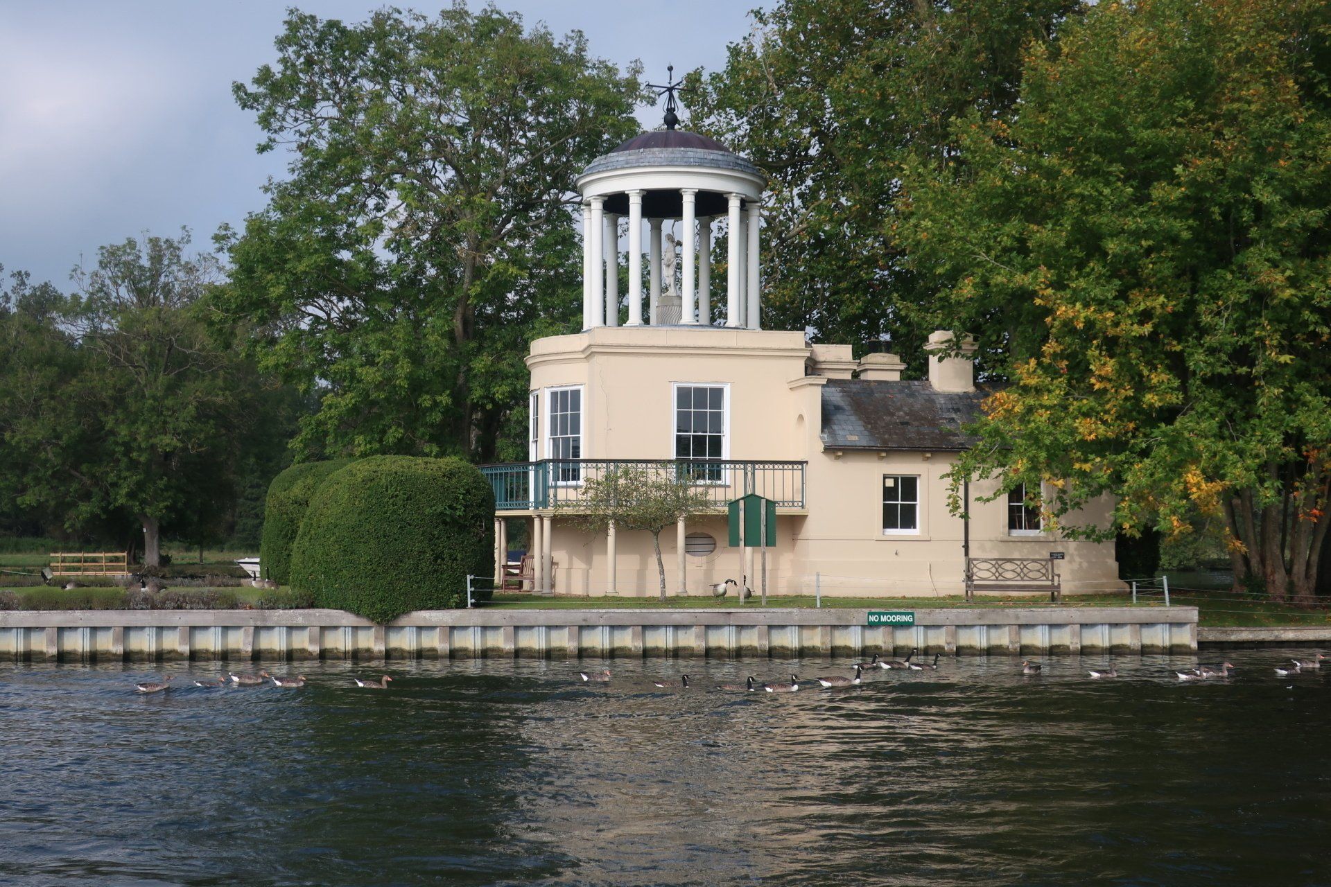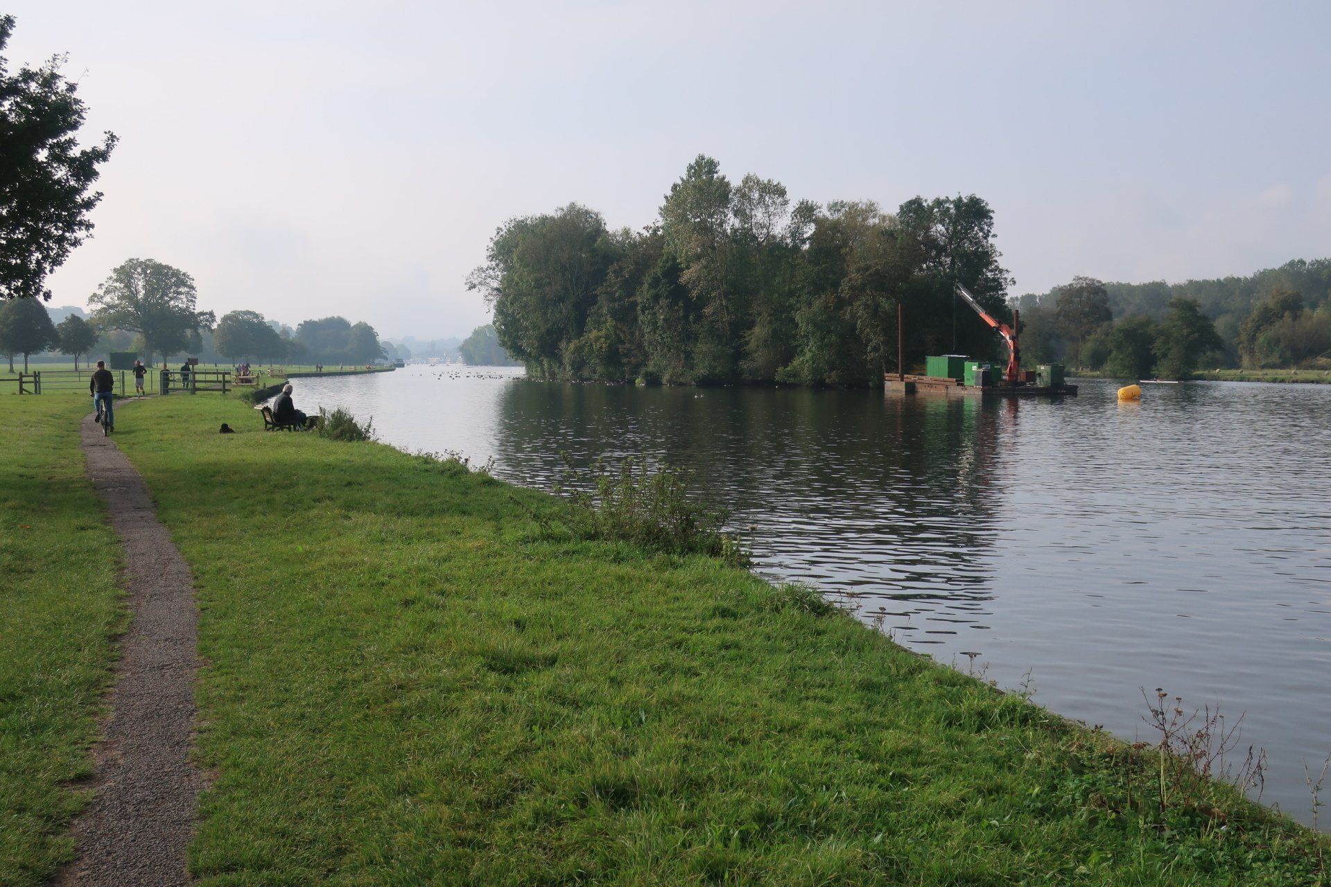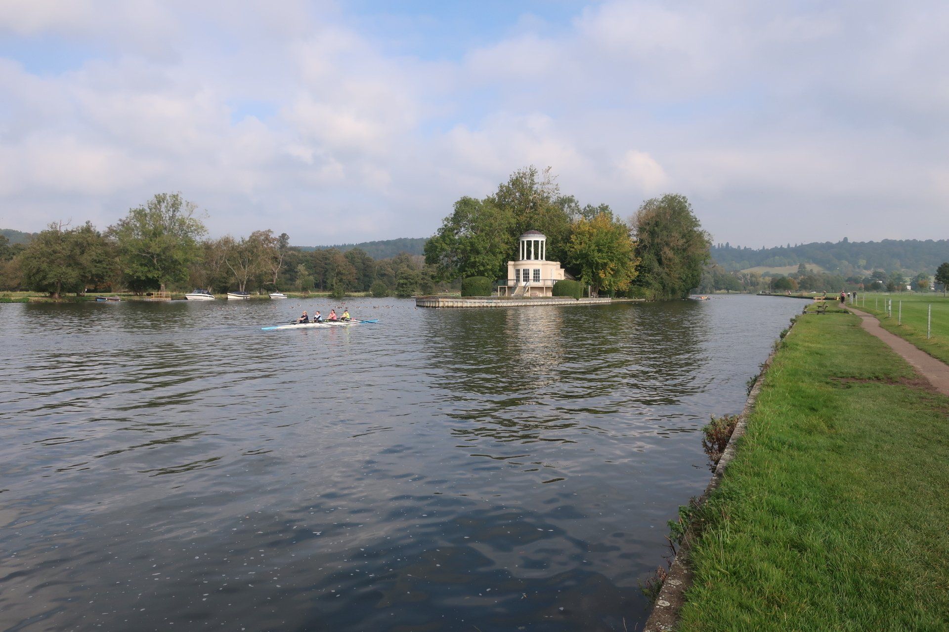 From here, I enter the Henley area, the rowing mecca. Lots of crews are out training on the river, their coaches riding bikes on the river bank, shouting encouragement. Yesterday, I had quite a time on enclosed, tree lined paths, but these are wide open spaces and it is enjoyable to see the landscapes, especially with the sun out. Nearing Temple Island, the starting point for Henley Regatta, I realise there is some racing underway, with boats (canoes?) approaching. Some pass by and the effort and exertion from the rowers is intense…and they are not even half way yet