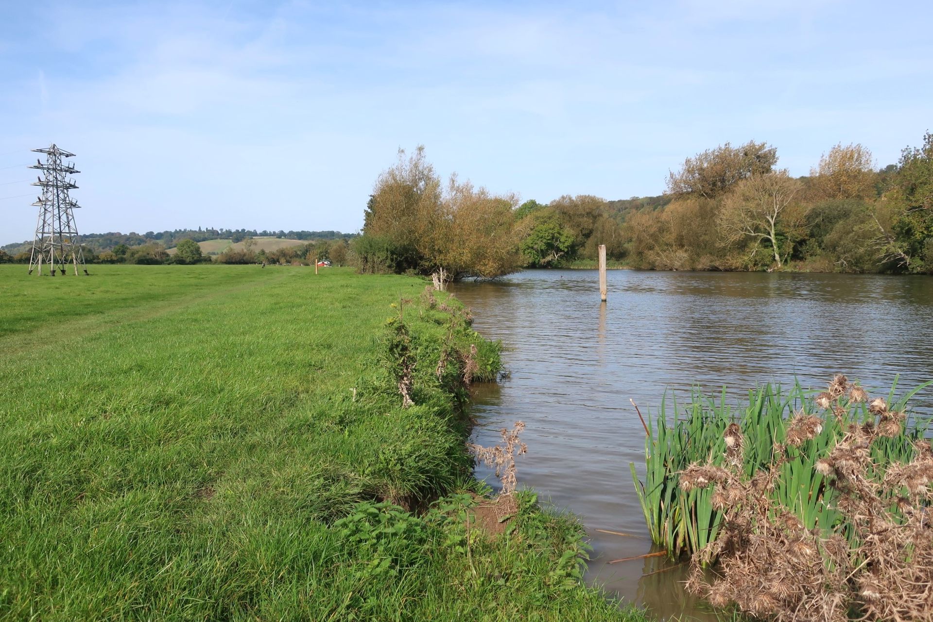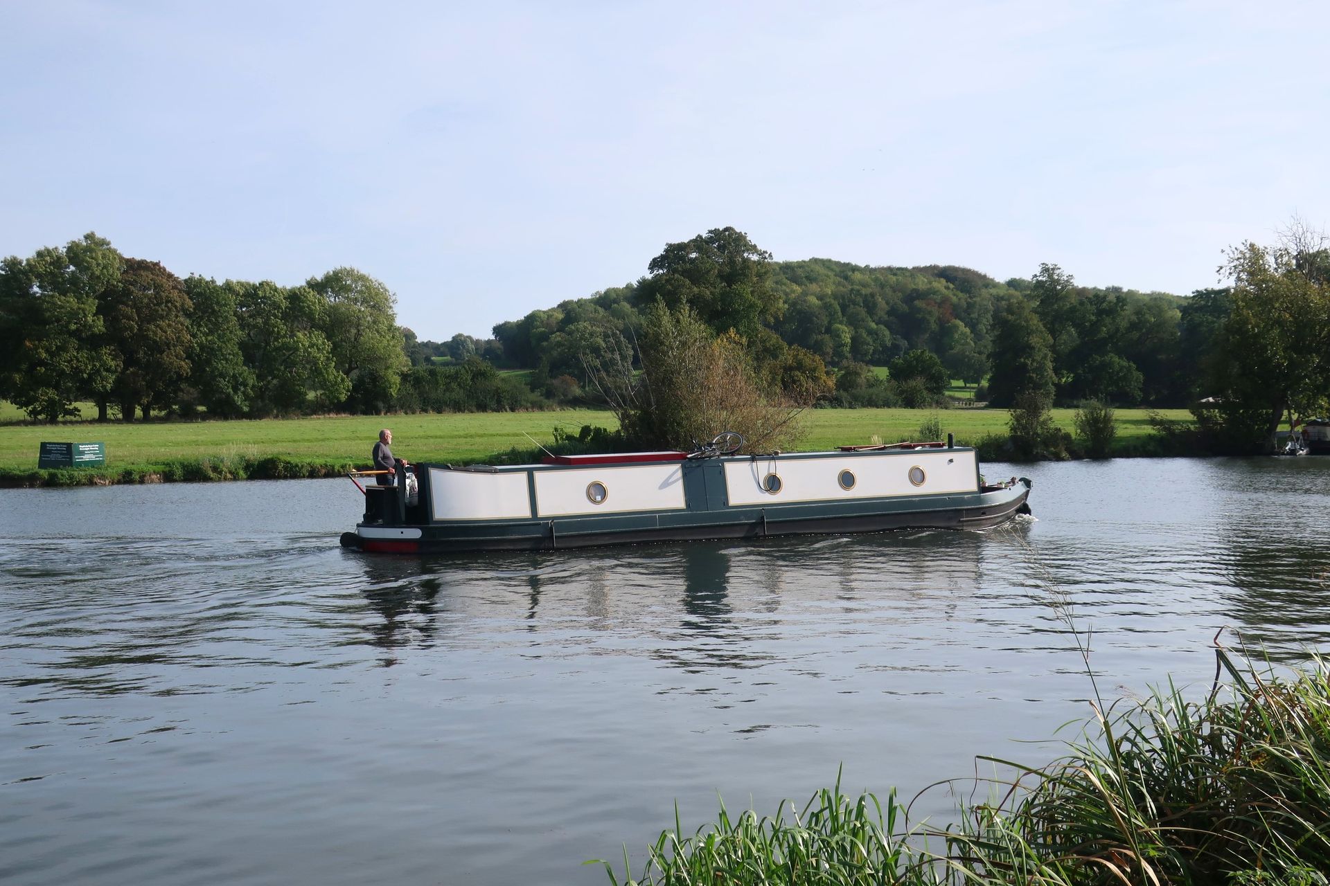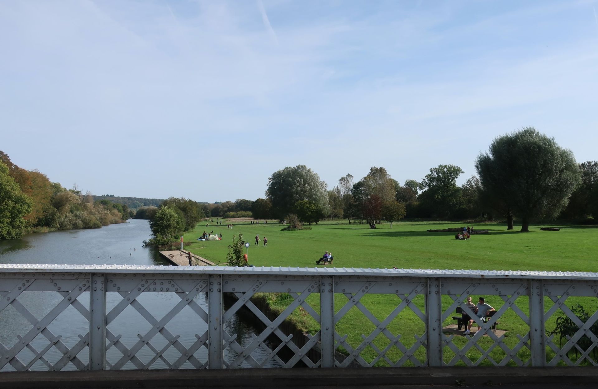 I cross the rather smart looking bridge at Pangbourne, a toll bridge – 60p for cars, free for those on foot – to reach the village of Whitchurch-on-Thames, where I call in at The Greyhound Inn for drinks and snacks. The refreshments is needed as I enter the Goring Gap, a valley carved through the chalk hills, and actually need to climb a hill and steps! Ok, not a very big one, but a first for the Thames Path. The trail trundles along in woodland but at a higher level, giving glimpses of the river from above and the rolling hills in the background – a different view to the norm. This continues for a while, before returning to the riverbank and more meadows. Again, more walkers, swimmers and others messing about on the river one way or another